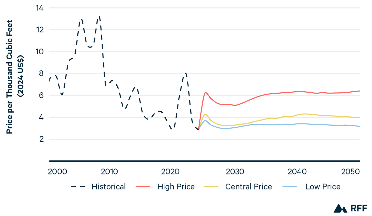 To test this idea, we used Haiku, an RFF model that simulates the power sector and projects how a fossil energy future would impact electricity prices. We simulated the US power grid under two different policy scenarios: (1) under both the IRA clean energy tax credits and EPA’s carbon pollution standards and (2) under the OBBBA revisions to clean energy tax credits without EPA’s carbon pollution standards—and compared the wholesale electricity prices in both scenarios when subjected to three price paths for natural gas. The three price paths are shown in Figure 1, along with historical natural gas prices, to highlight the volatility of these prices in recent years.
