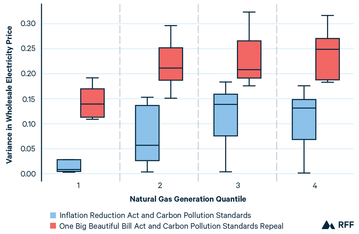 The box-and-whisker plots in Figure 2 show the distribution of the calculated state-level variances. For each box plot, the center line indicates the median variance for the wholesale electricity price of all states in a given quantile, and the box itself represents the middle 50 percent of variances (i.e., from the 25th to the 75th percentile). States that are least reliant on natural gas for electricity generation are classified in Quantile 1, while states that are most reliant on natural gas are in Quantile 4. In Scenario 1 (shown in blue), the IRA’s clean energy tax credits and EPA’s carbon regulations incentivize investment in renewable technologies, driving a shift away from high-emission fossil generators. In contrast, Scenario 2 (shown in red) shows OBBBA’s removal of the tax credits for renewables and repeals EPA’s regulations on natural gas and coal plants.