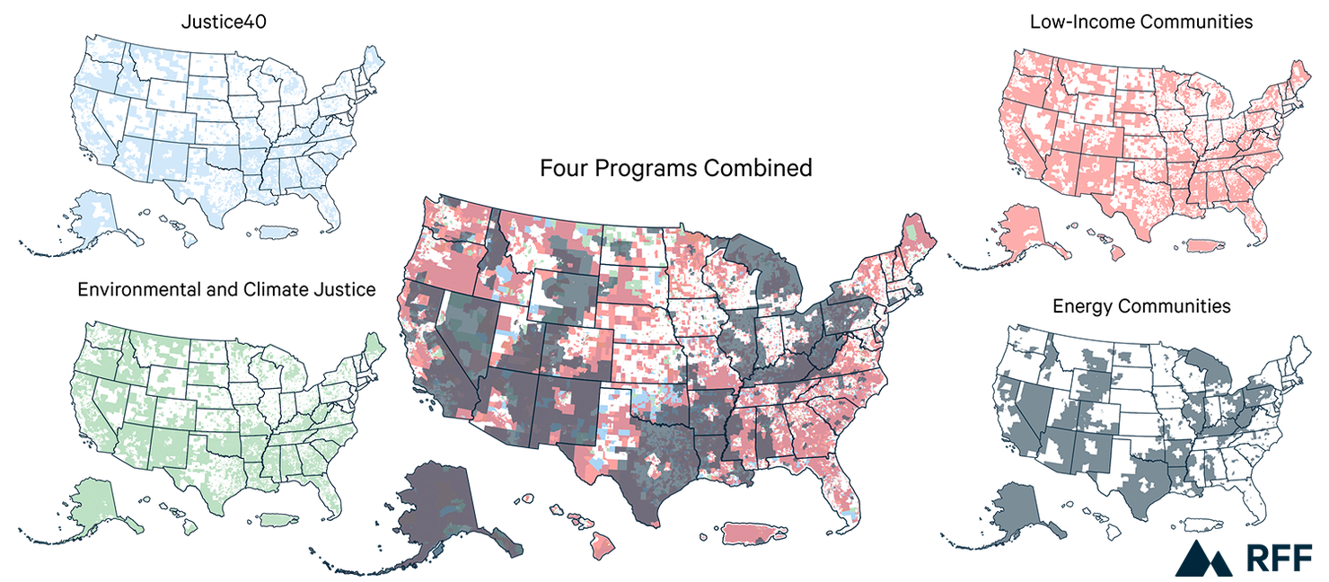 Although it is too early to evaluate the ultimate effectiveness of these place-based approaches, it is not too soon to assess whether the policies target the places that need the programs the most. We did so by selecting and mapping four major energy and environmental place-based programs, three of which were congressionally mandated under the Inflation Reduction Act, and one that stems from an executive order issued under the Biden administration: