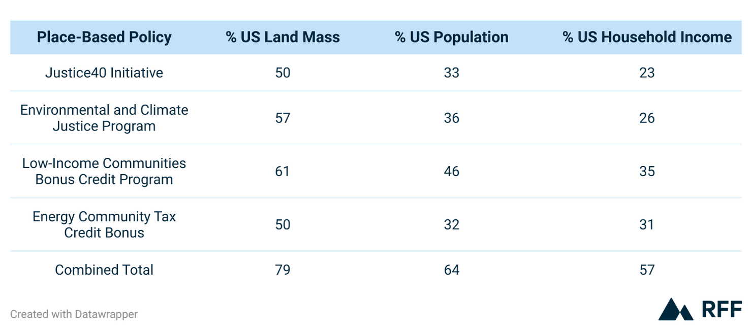 Because qualifying for these place-based energy and environmental policies can happen in so many different ways, and because some geographic groupings (such as nonmetropolitan statistical areas, Native American reservations, and others) can each cover thousands of square miles, these four policies end up covering most places (and people) in the United States.