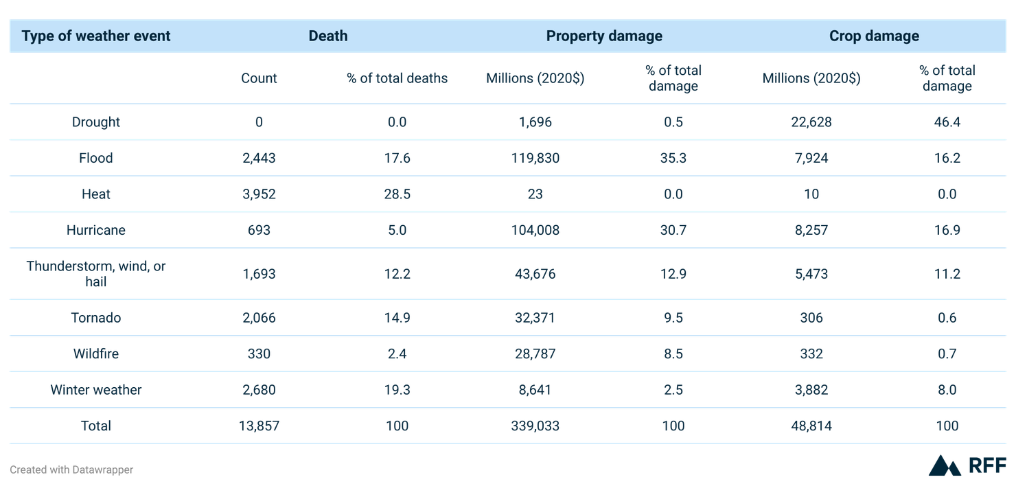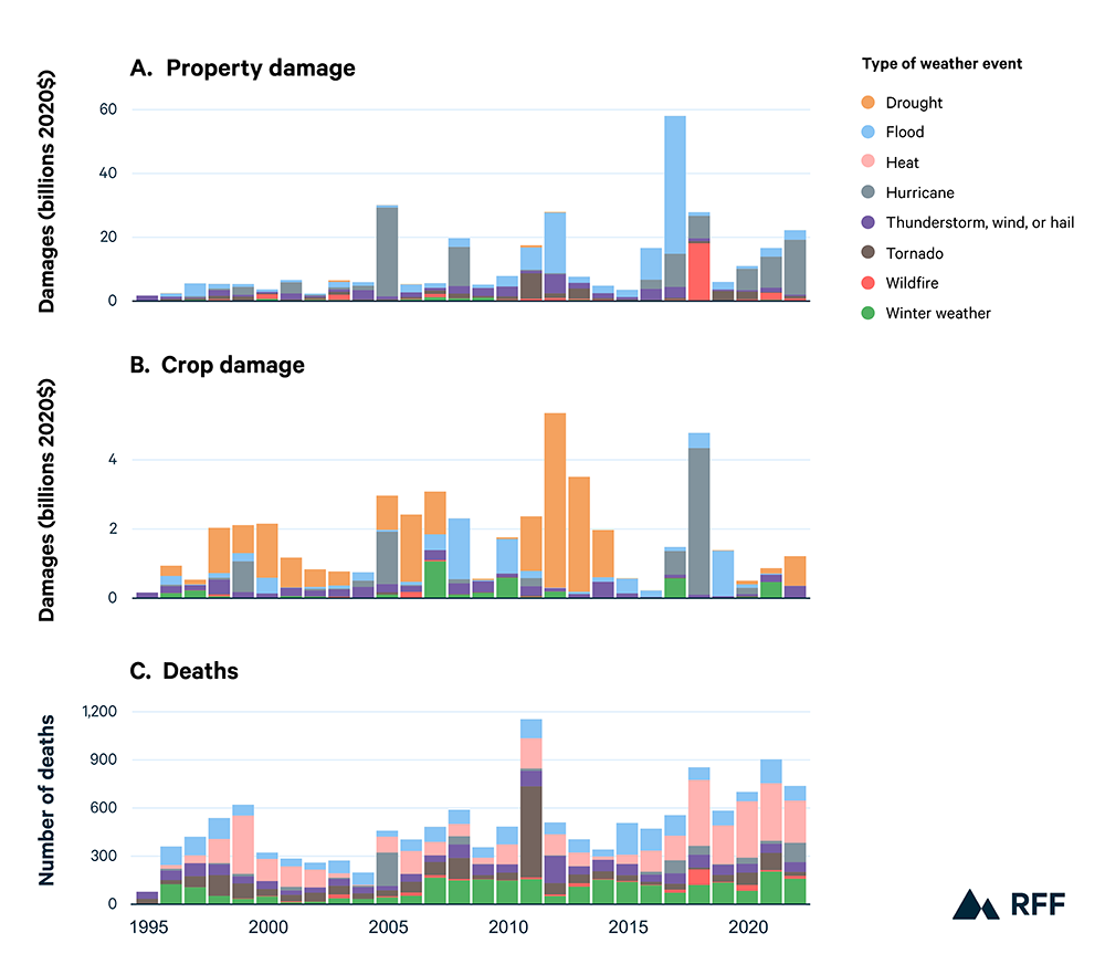 Between 1995 and 2022, extreme weather events collectively caused 13,857 deaths, $339 billion (2020$) in property damage, and $48.8 billion (2020$) in crop damage.
