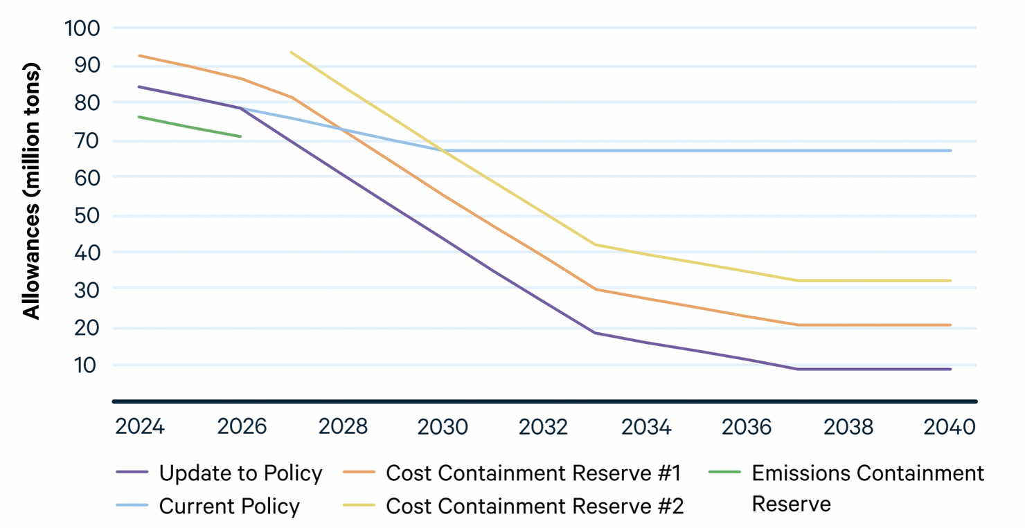 Under the program update, the cap will be reduced to 70 million tons in 2027. Emissions allowances can be banked (saved) for use in subsequent years. The prior declining emissions trend has enabled the bank of privately held allowances to accumulate to about 67 million tons, nearly equal to the current annual cap of about 80 million tons.