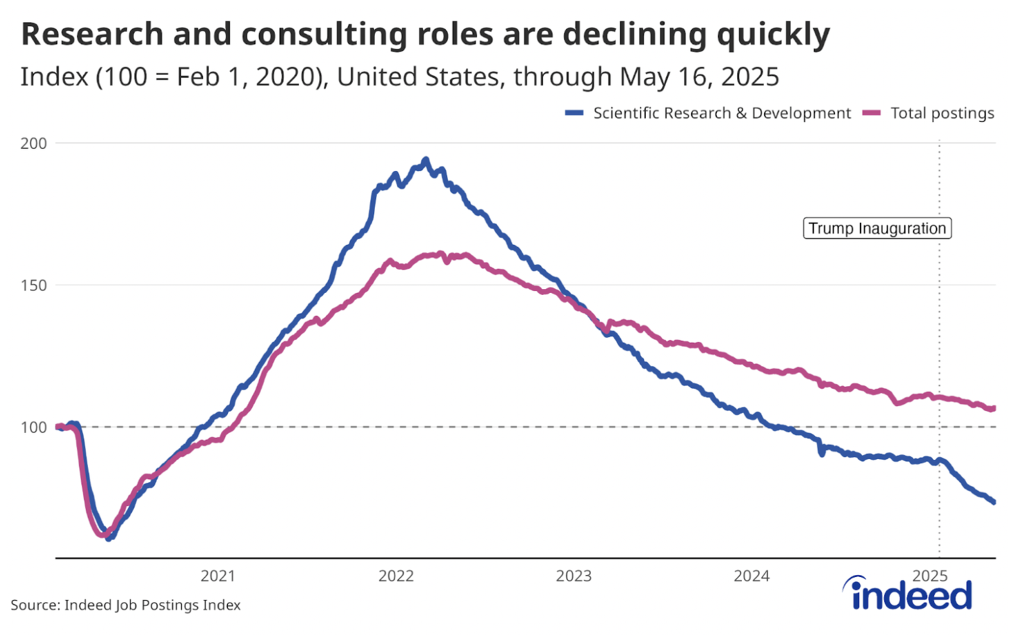 Job postings for scientific research and development positions on Indeed have dropped by 18 percent since January 20, continuing a downward trend that began in 2022. The recent sharp decline coincides with the Trump administration prioritizing reductions in federal spending, particularly by cutting scientific research contracts—which likely dampens demand for research roles that rely on government funding.