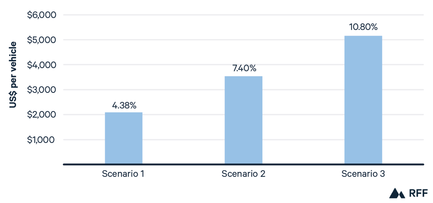 Vehicle prices are projected to increase with the stringency of the tariffs. In the current situation (approximated by Scenario 2), prices on average go up by about $3,500, or 7.4% (Figure 1). However, if Canada and Mexico also face 25% tariffs (Scenario 3), prices would increase by over $5,000.