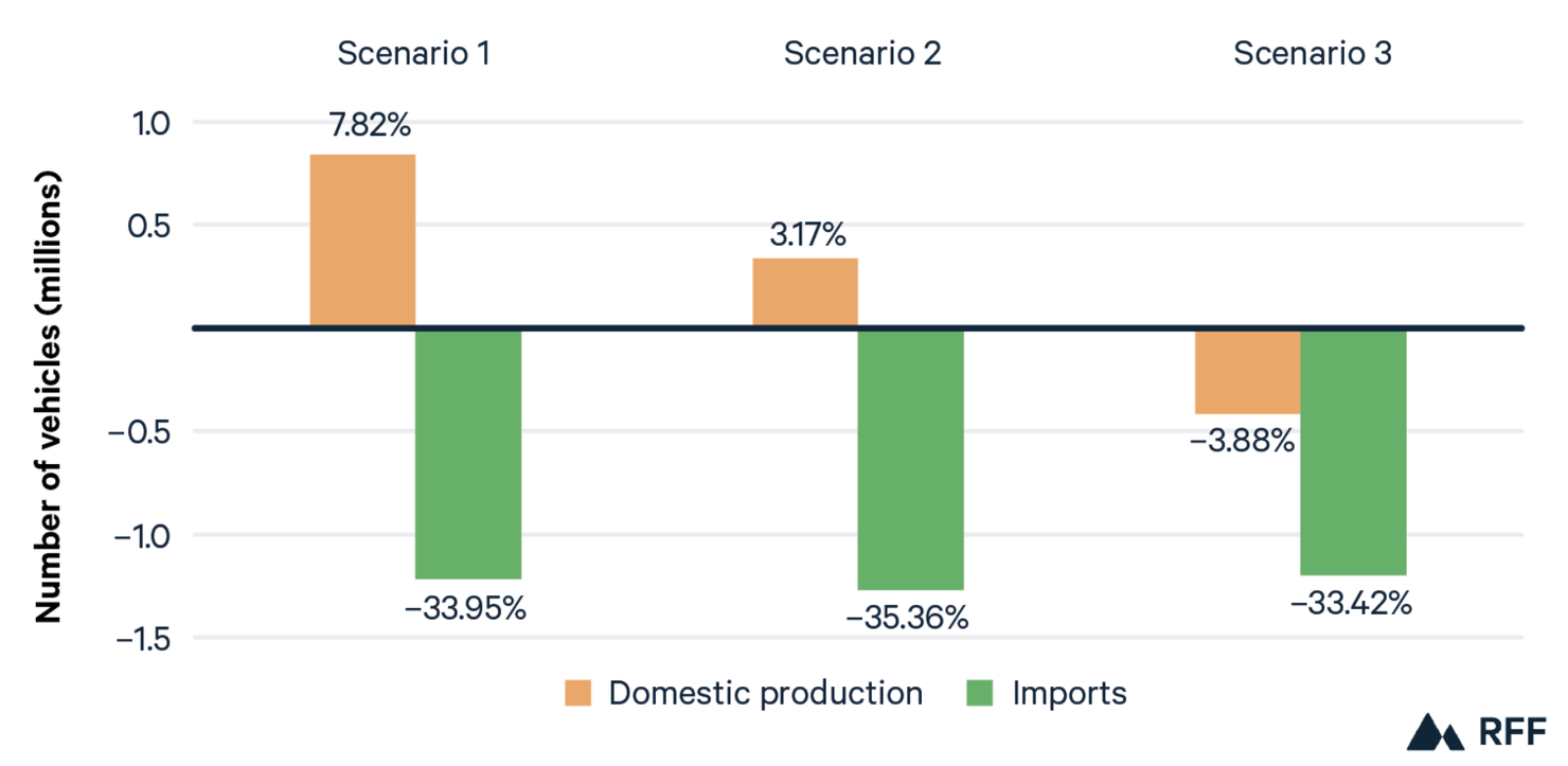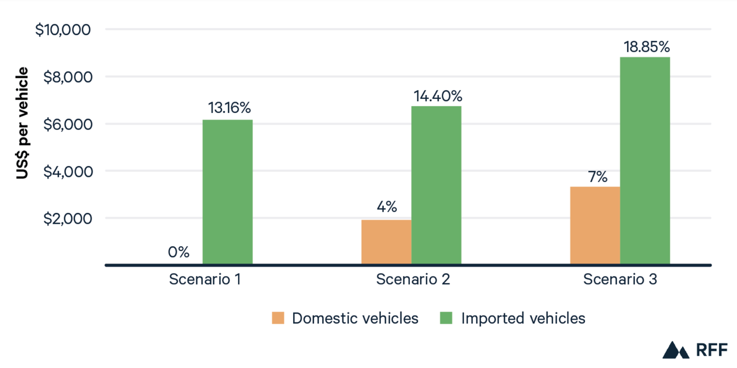 Because domestically assembled vehicles do not rely entirely on imported parts, the prices of domestic vehicles increase less than the prices of imported vehicles, which would increase by more than $8,000 in Scenario 3 (Figure 2).