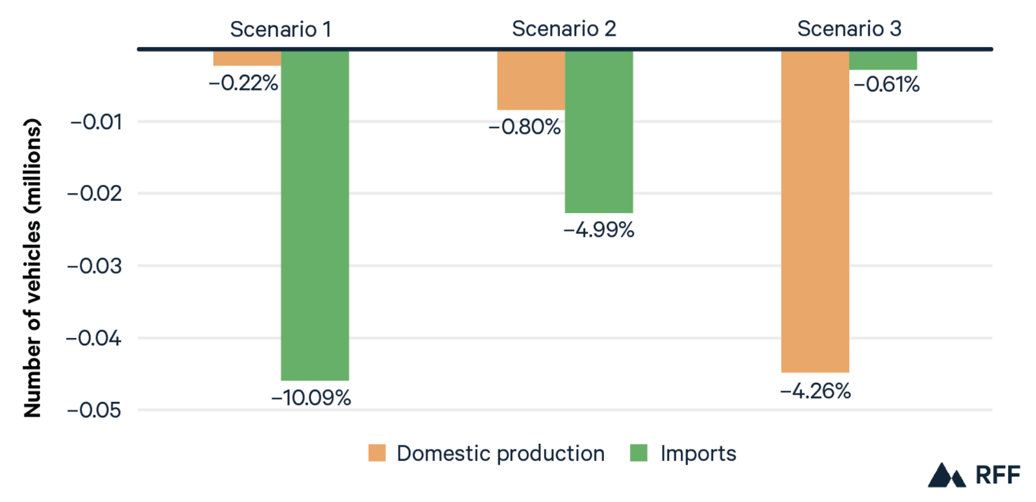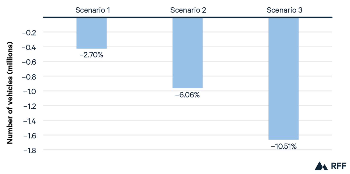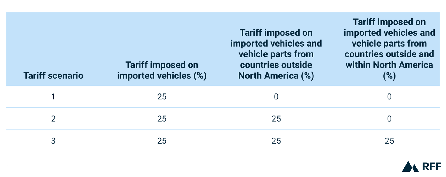 We used the Resources for the Future Vehicle Market Model to estimate the effects of these three tariff scenarios, relative to a baseline that excludes any tariffs on vehicles or parts.
