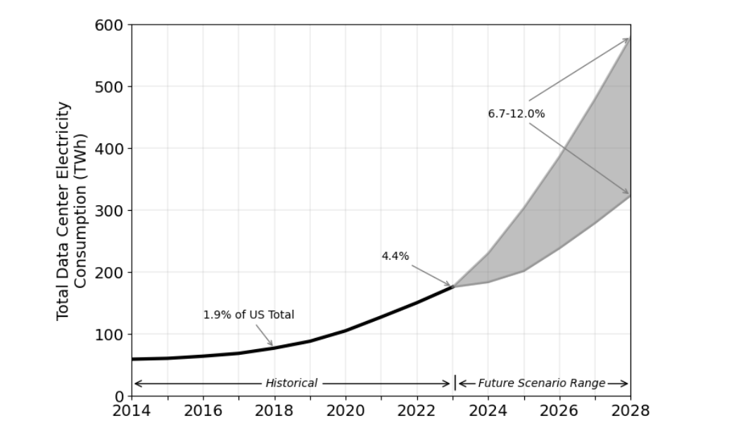 In their analysis, which predicts future electricity demand by tracking the demand for data center equipment like chips, the Lawrence Berkeley National Lab estimates that demand could reach 325–580 terawatt-hours by 2028, representing 6.7–12 percent of total US load (Figure 2).