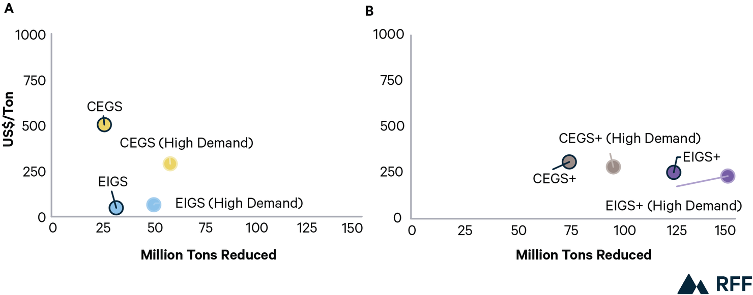 These three types of policies would achieve different emissions reductions at different costs (Figure 1). The scenarios illustrated here include a companion regulation that would apply the same standard to both within-state electricity generation and within-state electricity consumption. The change in emissions at the national level could be greater or less than the change within Maryland, due to electricity transmission across state borders and changes to investment in clean energy going forward. Figure 1A, which shows the scenario of expected electricity demand, indicates that an emissions intensity standard in Maryland (labeled “EIGS” because this version includes a companion regulation on generation as described above) would reduce national carbon dioxide emissions by about 30 million tons at an average cost of $48 per ton. An emissions intensity standard also would generate revenues through alternative compliance fees, equal to over 5 percent of retail electricity sales. The accumulation of these revenues would provide an opportunity to compensate consumers or make additional energy investments. Under high future electricity demand, an emissions intensity standard would reduce emissions by about 50 million tons of carbon dioxide.
